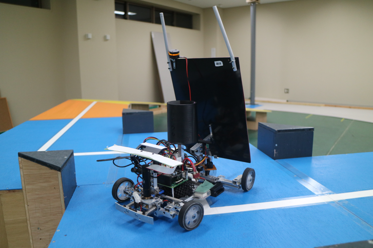概要:自走出来ないエコロボット(ER)にプロペラを持たせ、所定のコースをハイブリッドロボット(HR)から力を与え走らせる。コースの終わりでプロペラをERからHRに渡し、HRがポールを登って取り付ける。