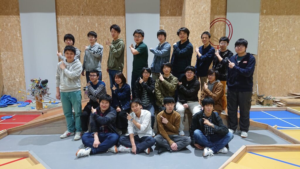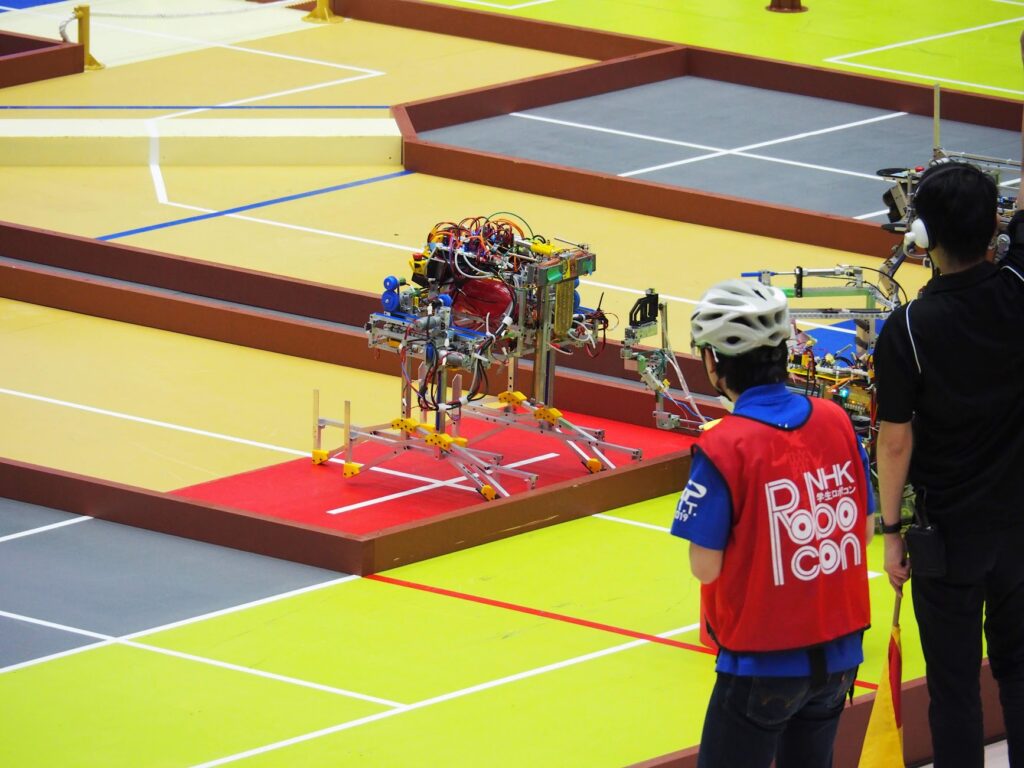 競技ルール概要:競技は2台のロボットで行われる。1台目は人が操縦できるメッセンジャーロボット1(以下MR1)である。MR1はゲルゲと呼ばれる通行証をもってスタートし、森や川といった障害物を突破してもう一台のロボットであるメッセンジャーロボット2(以下MR2)にゲルゲを渡す。MR2は4本の脚をもった自動ロボットであり、段差やロープを突破する。MR2がロープを突破したことを確認したら、MR1はシャガイと呼ばれるオブジェクトを投擲する。投擲したシャガイが50点以上獲得したらMR2は山道を登り、頂上でゲルゲを掲げることで条件達成である『ウーハイ』となり勝利する。